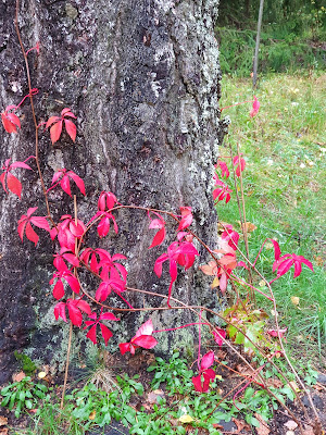Loppukesällä pääsin sattumalta käymään pikaisesti puutarhamyymälässä. Pakkohan sieltä jotain oli ostaa. Keksin, että villiviininkin voisi laittaa kiertämään koivunkannon ympärille. Vasta mökillä katsoin sen vaatimukset kasvupaikan suhteen. Sen pitäisi olla tuore ja multava ja sitä kannon ympäristö ei ole. Kaivoin ison kuopan, johon laitoin ostomultaa ja kastelin villiviiniä ahkerasti. Ainakin ensimmäisenä syksynä se väritti pihaa hienosti.